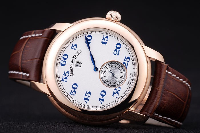 A Jules replika óra barna krokodil bőrszíjjal rendelkezik, amelynek fehér cérnával való varrása és hő dombornyomott Audemars Piguet nevét és logóját viseli magán. A 245 x 22 mm-es karkötőhossz és a 50 x 40 mm-es átmérő ideális kényelmet biztosít viselőjének. A finom kidolgozású 11 mm vastagságú tok eleganciát kölcsönöz a megjelenésnek. A zafír kristály üveg és az 18k rózsa arany bevonatú koronával ellátott óra nem csupán egy időmérő, hanem egy igazi ékszer is.