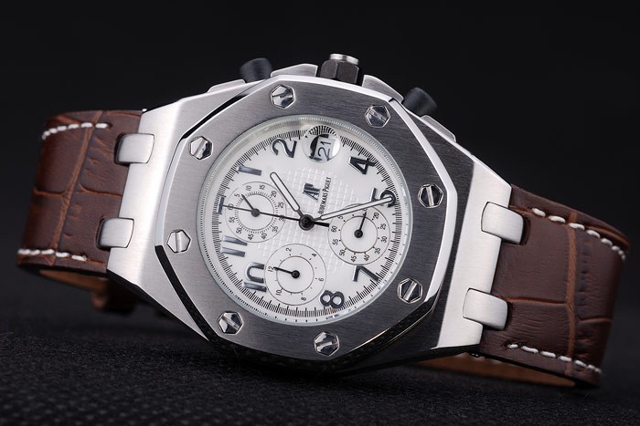Case: Csiszolt rozsdamentes acél tok br> szíj: sötétbarna krokodil bőrszíj fehér cérnával varrással és hő dombornyomott Audemars Piguet nevét és logóját, valamint egy Audemars Piguet feliratos rozsdamentes flip-át horog csattal katalógusa karkötő hossza: 205 x 22 mm katalógusa Keret: szálcsiszolt rozsdamentes Acél hatszögletű csavaros lefelé Beszel