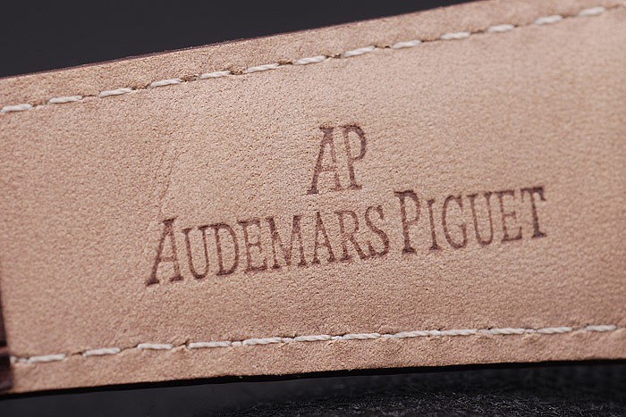 Case: Csiszolt rozsdamentes acél tok br> karkötő: barna krokodil bőr heveder fehér szál varrással és hő domborított audemars piguet név és logó és egy audemars piguet írt rozsdamentes acél flip-over horogra vágás