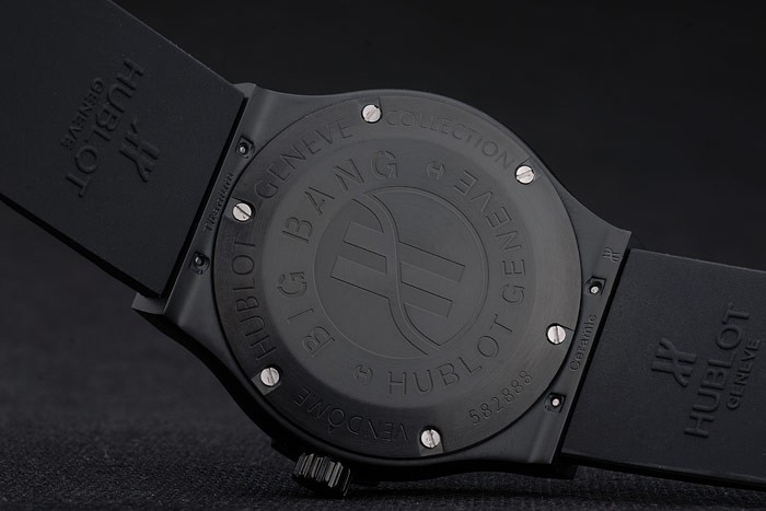 Case: Ionozott rozsdamentes acél tok – karkötő : HUBLOT GENEVE HEAT dombornyomott bordázott fekete gumi heveder HUBLOT GENEVE gravírozott ion bevonatú nyomógombos tapadás