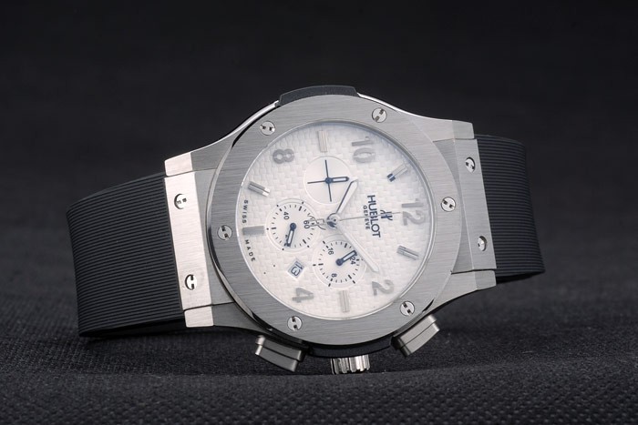 Case: csiszolt rozsdamentes acél tok – karkötő: HUBLOT Geneve Heat domborított bordázott fekete gumi heveder HUBLOT GENEVE gravírozott csiszolt rozsdamentes acél push kioldó hook clasp