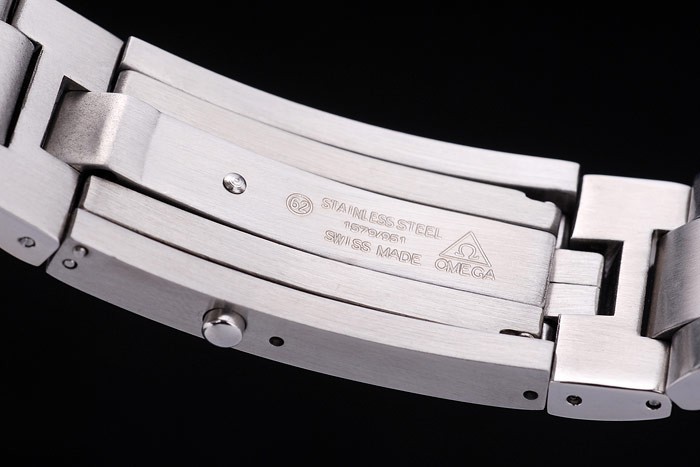 Korona: polírozott rozsdamentes acél vágás korona Omega logóval és egy másik hasonló korona az ellenkező felső sarokban